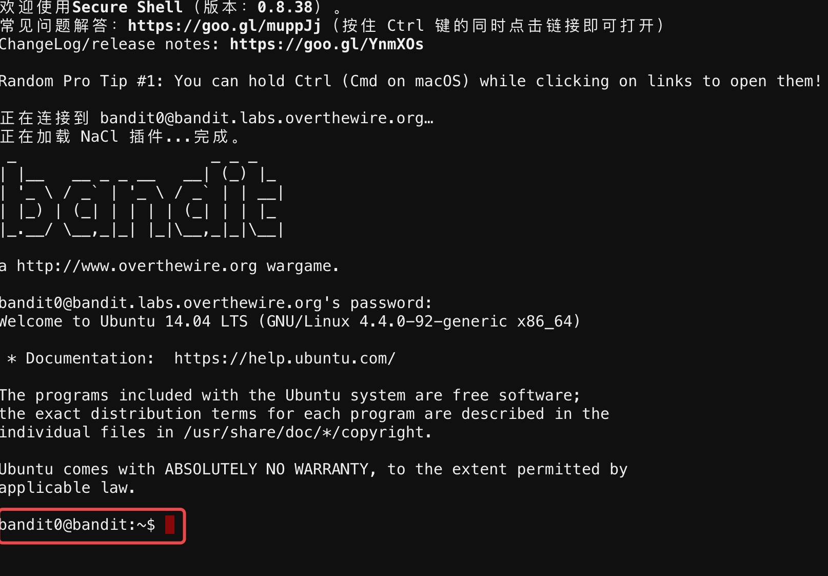 我们需要使用这个账号登陆服务器并找到「bandit1」的密码,然后使用得到的密码登陆「bandit1」,再找到「bandit2」的密码……